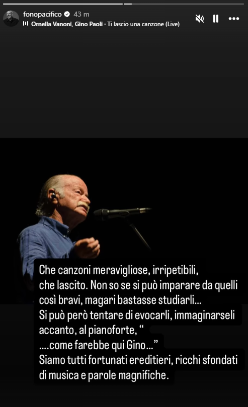 “Che canzoni meravigliose, irripetibili, che lascito. Non so se si può imparare da quelli così bravi, magari bastasse studiarli… – scrive sui social Pacifico – Si può però tentare di evocarli, immaginarseli accanto, al pianoforte, “… Come farebbe qui Gino…”. Siamo tutti fortunati ereditieri, ricchi sfondati di musica e parole magnifiche“.