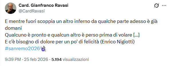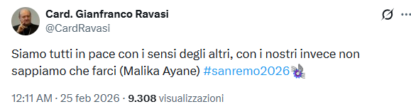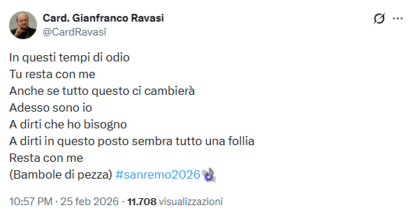 Sono anni che il cardinale Gianfranco Ravasi, è un attento osservatore del Festival di Sanremo, ed anche quest’anno, già prima dell’avvio, lo aveva ribadito su X