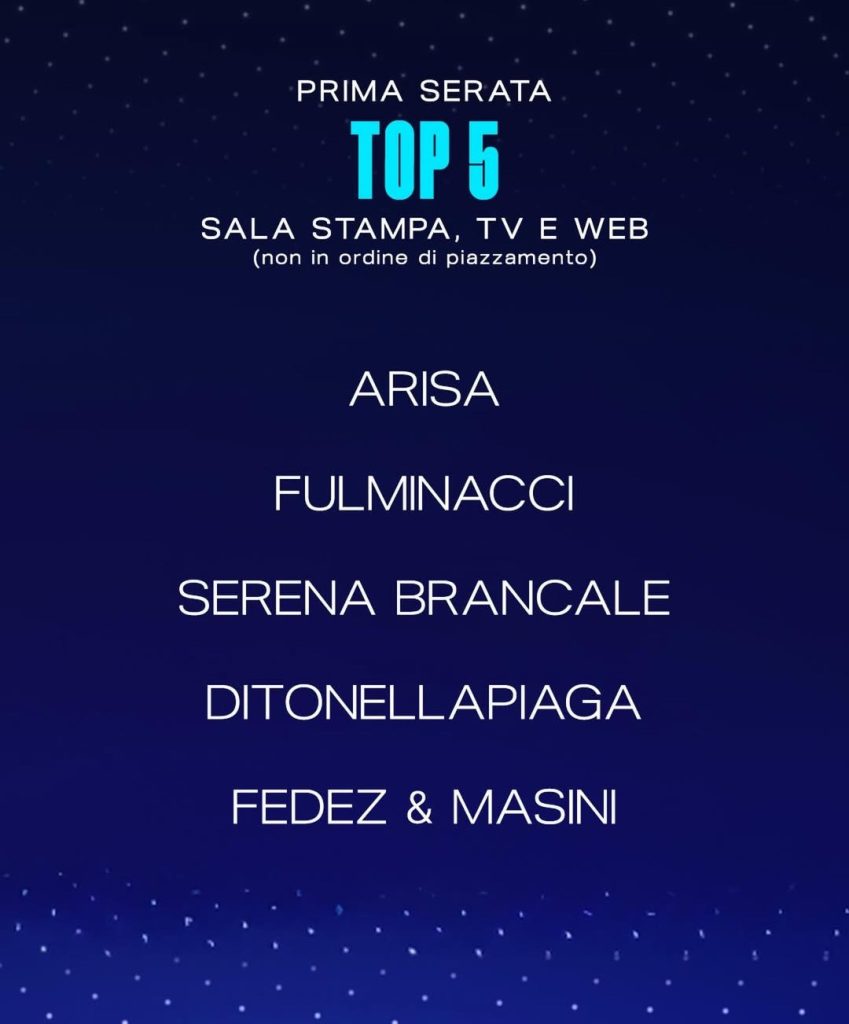 La cinquina (non in ordine di piazzamento) uscita alle 01:30 dalla votazione della giuria della sala stampa, tv e web nella prima serata del 76° Festival di Sanremo.
